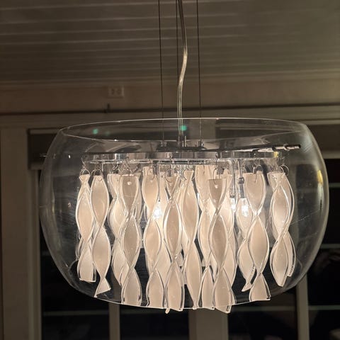 Taklampe med klart glasskuppel og flere dekorative, vridde hvite elementer innvendig. Lampen er opphengt i taket med justerbar ledning og rund takfeste i metall. Passer til bruk som hovedbelysning i rom med takmontering.