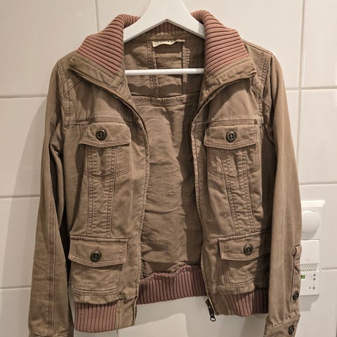 Beige Hollister jakke, kjøpt i Florida. størrelse L. Jakken har flere lommer og snøring i livet for justering. Materiale 100% bomull.