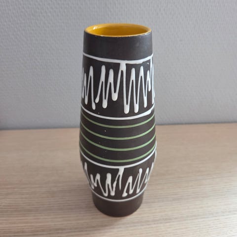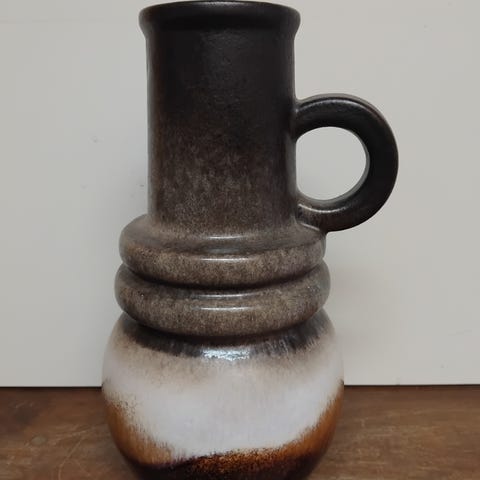 Vakker retro skål med flott mønster i fat lava stil fra West Germany. 18 cm I diameter. 5,5 cm høy. 24cm inkludert hank. Strøken.