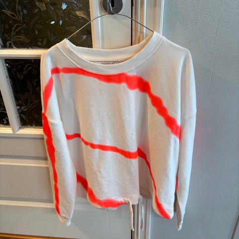 Jeg ønsker å selge en pen feilfri kortermet sommergenser, brukt en gang, blitt for trang, 95 % polyester og 5 % spandex, god elastikk.