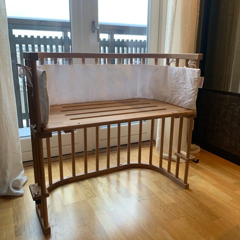 Babybay Bedside crib barnemøbel i hvit farge. Laget i tremateriale, designet for å plasseres ved siden av foreldreseng for enkel tilgang til barnet. Noen hakk i sengen. men ingenting av betydning. Følger med en madrass og madrassbeskytter.