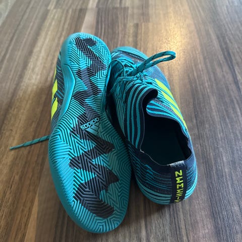 Adidas fotballsko i størrelse 41 1/2. Skoene er hvite med blå detaljer. Egnet for bruk i fotball.