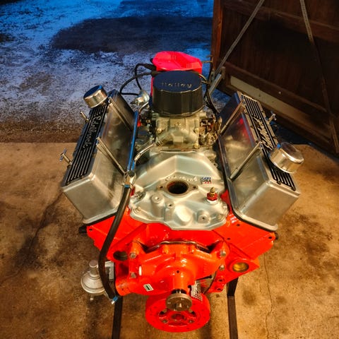 Motoren er komplett men må overhales, følger med Edelbrock Performer innsug.