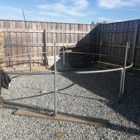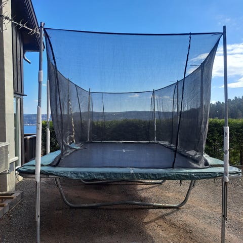 Stort og fin trampoline 4m x 2,4m med stige. Veldig solid konstruksjon. Liten hjul i dukk, men har blitt brukt i hele seasongen uten å bli noe større. Dukken har blitt oppbevart inne i løp av vinteren.