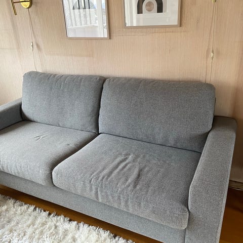 Pent brukt grå sofa, med avtakbare trekk som kan vaskes. Det følger også med 5 ekstra trekk. Veldig god å sitte i. God kvalitet på sofaen. (Litt usikker hvor vi kjøpte sofaen, om det var Bohus eller Skeidar).