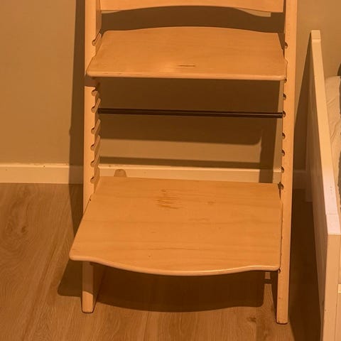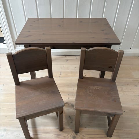 Pent brukt bord av tre og stol selges.