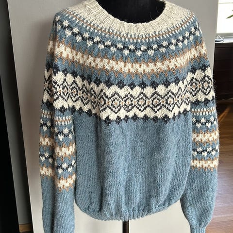 Strikka med fritidsgarn frå Sandnes Garn og tova i vaskemaskin på 40 grader. 100% ull. Lett tovet. Romslige. Kan også passe til menn.