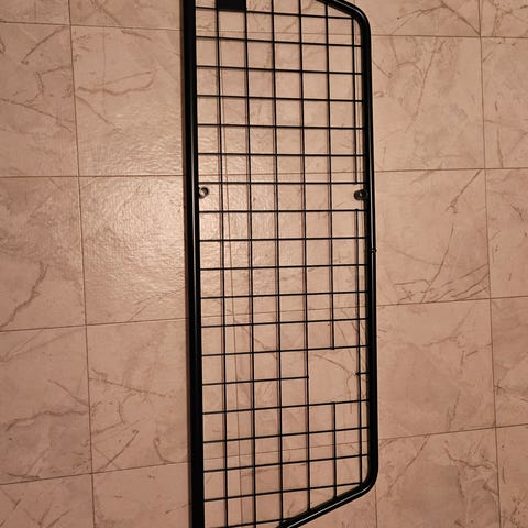 Hundegitter i svart metall, designet for sikker separasjon i bil. Passer for å holde kjæledyr trygge under kjøring. Enkel å montere. Enkel å tilpasse til din bil.