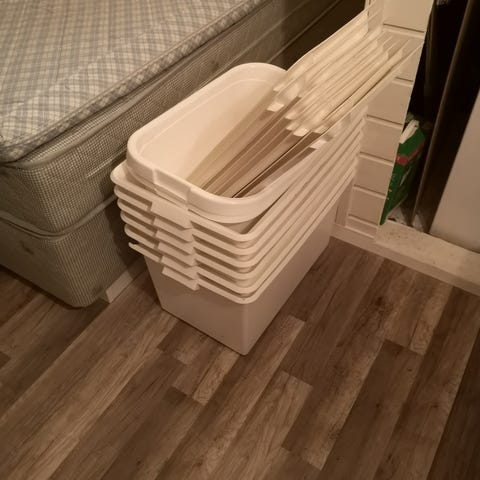 2 stk mørk grå, 50 liter, oppbevaringskurv selges i filt. Kjøpt på Jula, ny pris 100 kr/stk. Selges 50 kr for en eller 100 kr for begge.