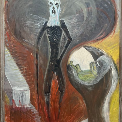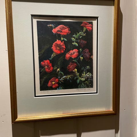 Signert oljemaleri på plate. Tror signatur er I. Loven 1914. Nydelige varme farger. Liten flekk maling er borte, se bilde. Mørke brun treramme, rammet inn av “Otto Sprenger … Hamburg … Mittelweg …”