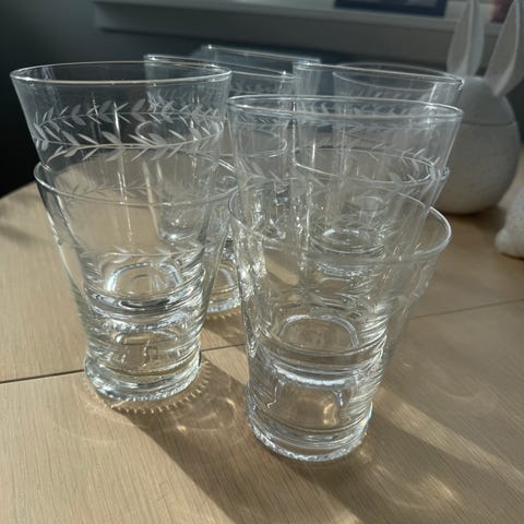 Selges da vi kjøpte litt for mange. 5 stk drikkeglass og 6 stk drammeglass/ shotteglass. Lite brukt. Laget av herdet glass som er slitesterkt og varig.