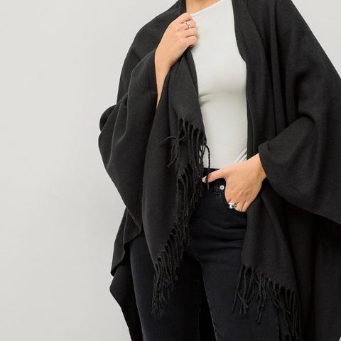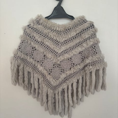 Poncho fra Haust med hette og pelsdetaljer. Hull til armer, one size.
