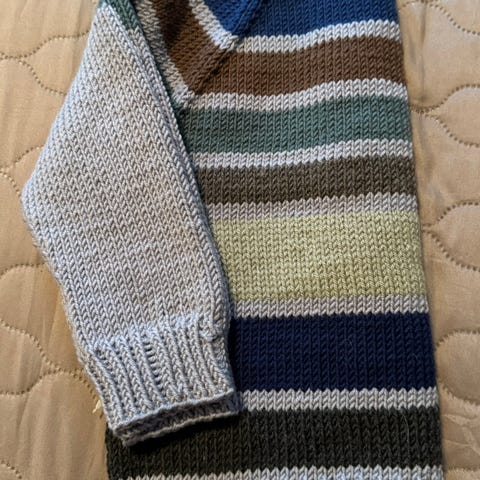 Nydelig myk og god genser, flott passform og garn. Mener det er merinoull med nylon, smartgarn. Kan måle hvis ønskelig å vite nøyaktig størrelse, men var strikket til en smal og lang 8 åring. Nydelig grå/brun og lys turkis farge. Veldig lite brukt -og kun under uteklær vinterstid