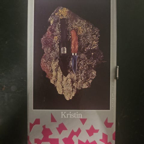 Selger en nummerert Kristin OL kniv fra Brusletto. Kniven er ubrukt, og som ny. Sliren har en liten revne på baksiden (se bilde), derfor den lave prisen. Sliren for øvrig er som ny. Kan sendes.