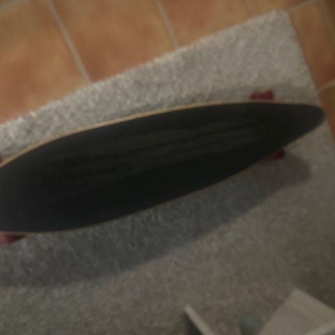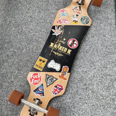 Longboard skateboard med svart grip tape og spillekortmotiv