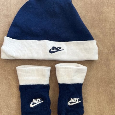 Nike bomullssett: lue, votter og tøfler (med borrelås). Nytt i eske.