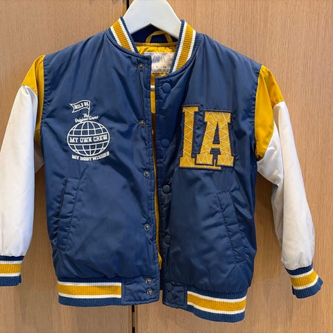 Kul bomberjakke i størrelse 152. Jakken er blå og har detaljer som New York-trykk på fronten og nummer 8 på ermet. Laget av polyester med ribbestrikkede kanter i hvitt og blått. Passer for barn og ungdom.