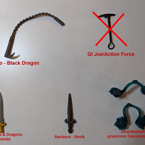 Selger diverse originalt tilbehør fra kjente 80-talls lekelinjer. Perfekt for samlere som mangler våpen eller deler til figurene sine. Alt er originalt, ingen reproduksjoner. God stand, lagret i mange år.