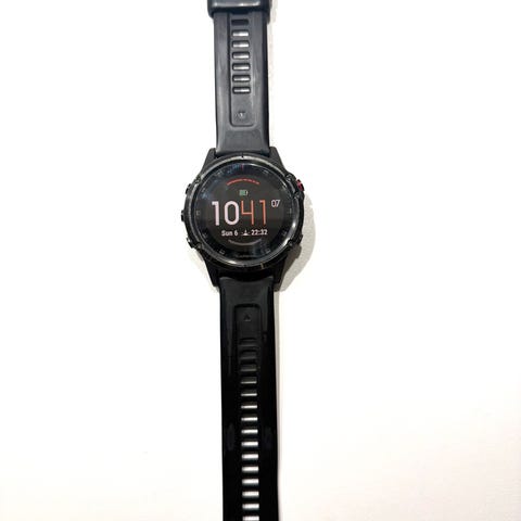 Garmin Fenix 5 plus smartklokke med svart farge og robust design. Klokken har en rund skjerm med digital visning, flere funksjoner for trening og helseovervåkning, samt en slitesterk uoriginal rem. Original rem ble ødelagt i gummien etter at jeg forsøkte å rense den for smuss. Egnet for både utendørsaktiviteter og daglig bruk.