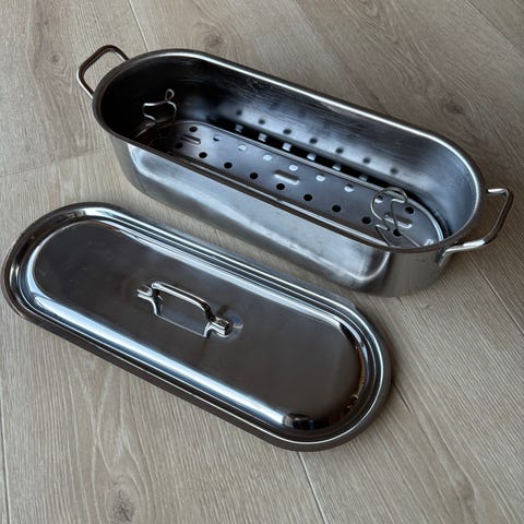 Til salgs en praktisk og romslig kjele. Perfekt til pinnekjøt, fiskemiddagen, damping av grønnsaker, sjømat eller stekepanne til hel kylling eller and. Mål 39.5×23×8,5. Nesten ikke brukt. Jeg sender ikke. Betales kun kontant. Oslo