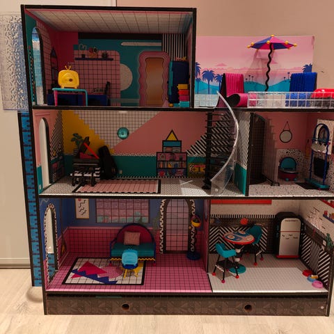 L.O.L. Surprise dukkehus i tre etasjer med flere rom og møbler. Inkluderer små møbler som seng, stol, bord og diverse tilbehør. Dukkehuset er designet for barn og har farger i pastell, hovedsakelig rosa og hvitt. Passer til lek med L.O.L. Surprise dukker og tilbehør.