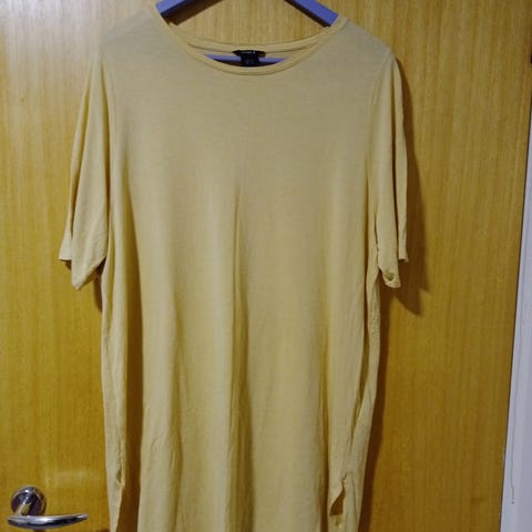 Lindex T-skjorte i størrelse XL for dame. T-skjorten er oransje med hvite striper og har 3/4 lange ermer. Materialet består av 95% økologisk bomull og 5% elastan.