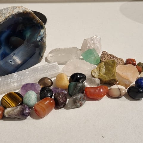 Samling av forskjellige mineraler og krystaller i ulike størrelser, farger og former. Inkluderer polerte steiner, rå krystaller, geoder og ametyst. Materialene varierer og kan inkludere kvarts, tigerøye, pyritt, agat og andre mineraler. Egnet for samlere, dekorasjon eller studier av mineralogi.