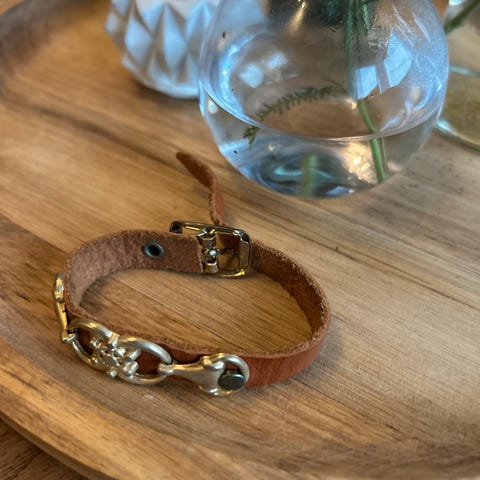 Armbåndet har dekorative sølvornamenter og en låsemekanisme med magnet.