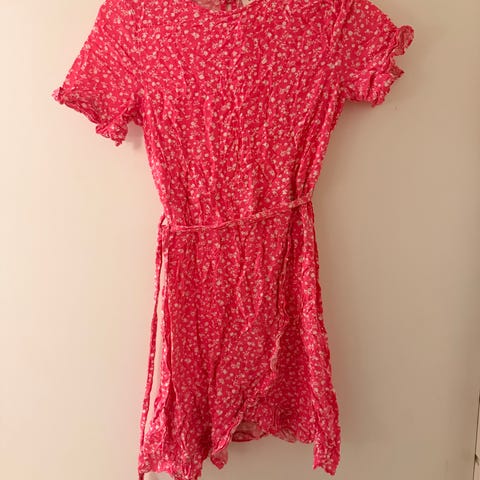 Kjolen har en vakker rødfarget bunn med rosa mønster, lange ermer og en flatterende drapering i midjen som gir en fin passform. Den er laget i et lett og behagelig stoff, perfekt både til festlige anledninger og en kveld ute.