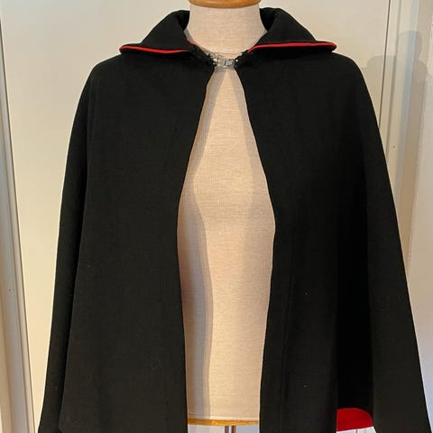 Selger min cape til Vestfold bunad 1956 modell da den ikke blir brukt. Sølvlås følger med. Vet ikke str men er 75 cm fra skulderen og ned bak og 60 cm fra halskanten og ned. Nypris med sølv er godt over 6000.