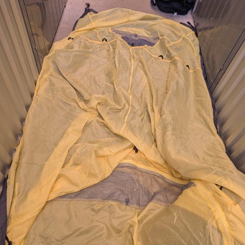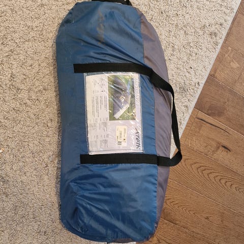 Ukjent merke pop-up telt i oransje farge. Teltet er laget av lettvektsmateriale og kommer med stenger for oppsett. Egnet for utendørs bruk som ly for en person. Mest mulig å bruke i hagen eller strand