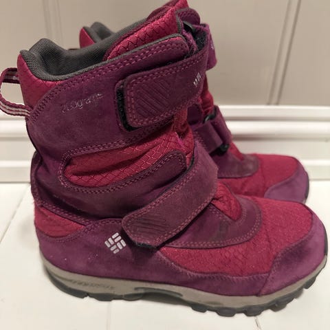 Timberland barn vintersko i størrelse 36, designet for jenter. Skoene har en burgunder farge og er laget med materialer egnet for kalde værforhold. De har borrelås for enkel justering og en robust såle for godt grep.
