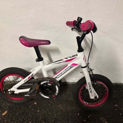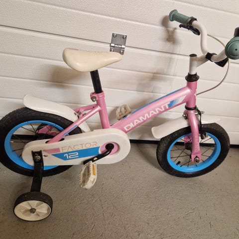 Diamant barne sykkel med 12 tommers hjul, hvit ramme og rosa detaljer på hjulene. Sykkelen har støttehjul, egnet for barn som lærer å sykle.