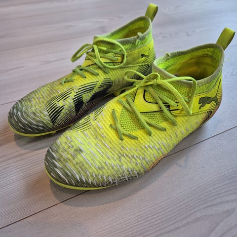 Puma ultra fotballsko i størrelse 38,5. Skoene er gule med svarte detaljer og har knotter for bruk på kunstgress og gressbaner. Materialet er syntetisk med en sokkelignende passform rundt ankelen for bedre støtte.