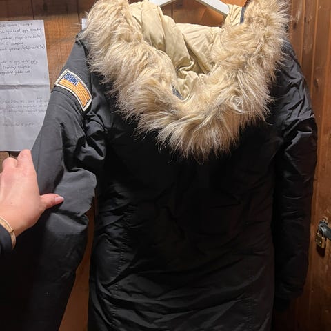 Figursydd dunjakke med knapper i front, glidelås med vindlås og to lommer. Hette med pelsimitasjon. Pels kan også kneppes av. Størrelse Medium. Jakke er 80% dun. Pent brukt men noen bruksmerker.
