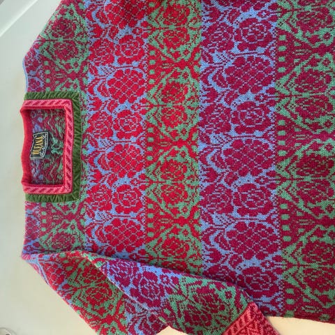 Meget pent brukt strikkejakke i ull fra Norway Design. Merke Gaula Design As, Budalen, Norway. Kjøpt første halvdel av 1990-tallet. Mønster i svart/beige. Knapper i plast, en av knappene ødelagt. Størrelse Large (liten large). Mål: fra krage til nederst rygg: ca 76 cm. Ermlengde: ca 71 cm. Vidde nederst: ca 115 cm. Vidde krage: ca 47 cm.