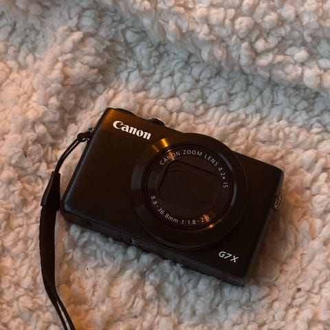 Canon G7X kompaktkamera med innebygd objektiv. Kameraet har en skjerm for visning av bilder og innstillinger, samt flere kontrollknapper for manuell justering. Designet for enkel bærbarhet og brukervennlighet.