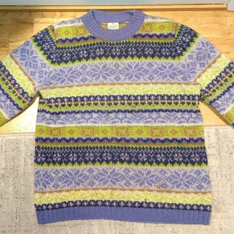 Genser/vest, lang og fin. Likner på mohair, ser islandsk firma som selger strikk i mohair. 80 cm fra skulder til nedre kant. Som ny