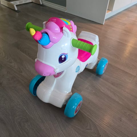 Enhjørning med hjul. Fire hjul for stabilitet. Inkluderer tre knapper med forskjellige symboler på fronten musikk og lyder. Egnet for små barn.
