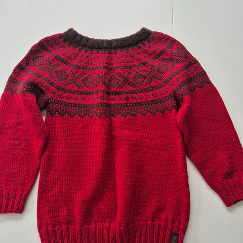 Nesten ikke brukt. Hjemmestrikket av høy kvalitet. Tykk og god. Ca str 128.