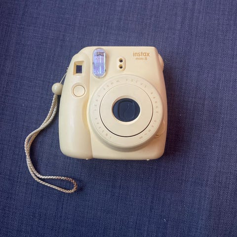 Fujifilm Instax Mini 8 Instantkamera/polaroid-kamera i hvit farge. Kameraet bruker Instax Mini film og har en kompakt design med innebygd blits. Egnet for øyeblikkelig fotografering med utskrift av bilder i miniatyrformat.