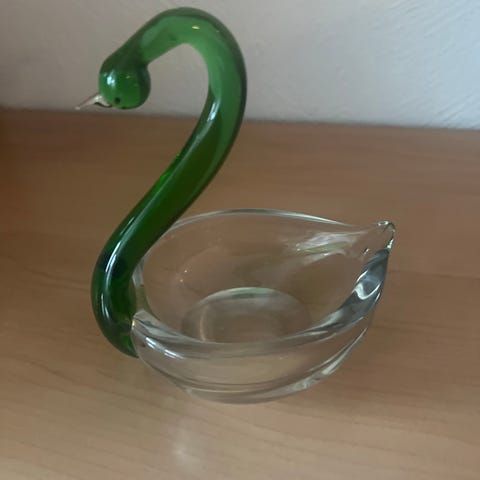 Glasskål i svaneform med grønn dekor