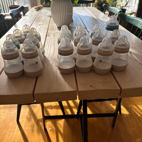6 pent brukte (4 stk 160 ml og 2 stk 260 ml) tåteflasker i fine nøytrale farger, selges samlet. Antikolikksystem, ventil i bunnen forhindrer dannelse av luftbobler, lekkasjesikkert lokk. Alle flasker er meget pent brukt (vasket og kokt).