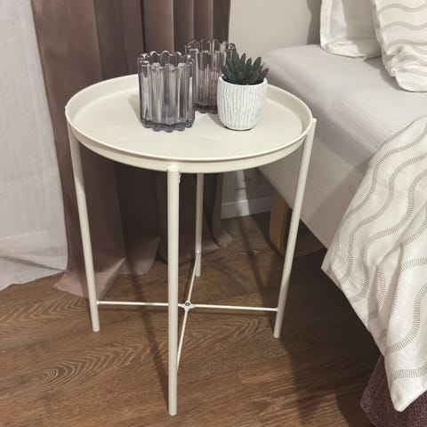 IKEA rundt bord med metallramme og hvit bordplate. Bordet har en åpen, kurvliknende metallstruktur som gir et luftig uttrykk. Passer til bruk som sidebord eller småbord i ulike rom.