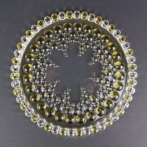 En oval cabaret/serveringsfat med fire rom, i tykt glass med isstruktur og blomster- og rankemønster. Antatt produsert av Walther Glas, Tyskland. 1970-tall.