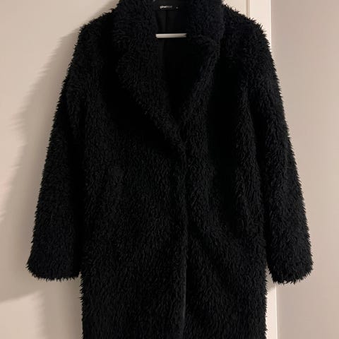 Monkl Annet yttertøy kåpe i svart farge, størrelse L. Laget i et mykt og pelslignende materiale, designet for kvinner. Kåpen har hette og lang lengde, egnet for kaldt vær.