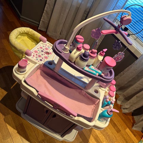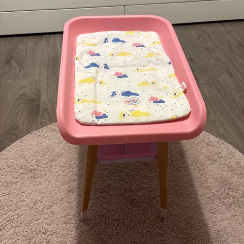 Baby Born Stellebord for dukke, hvit madrass med mønster av fargerike figurer. Stellebordet har en liten oppbevaringshylle under.