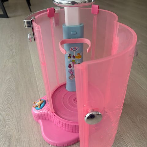 Baby Born Bath dusjen er tilpasset Baby Born-dukker slik at de selv kan stå inne i dusjen, festet med en klips mens du vasker dukken. Ved å snu anden Berta vil vannet strømme ut gjennom dusjhodet.