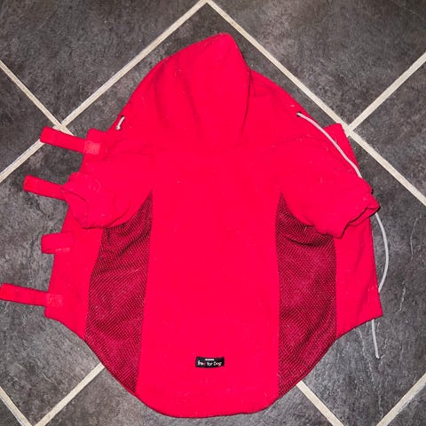 Fleecefôret jakke med refleks og justerbar stropp. Kun brukt et par ganger. For stor til hunden min. 40 cm lang.