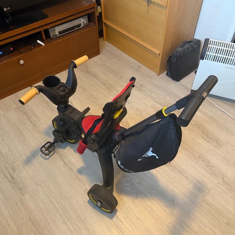 Lite brukt trehjulssykkel som kan brukes fra 15-30 måneder. Følger med seler og ramme som slåss opp rundt for de minste barna. Har hatt en liknende tidligere med plasthjul som bråkte noe fryktelig på asfalt. Denne har gummihjul som ikke bråker i nærheten. Fantastisk for oss foreldre 😂